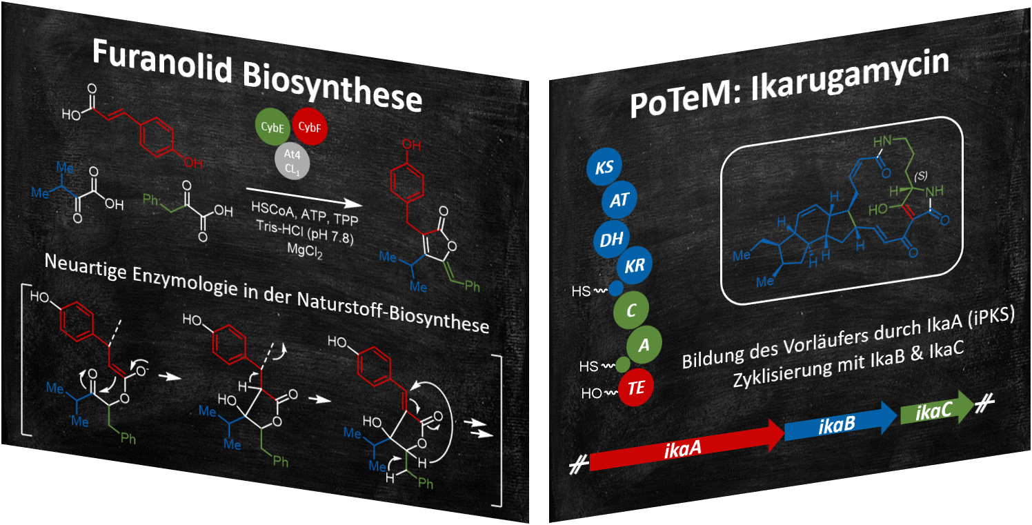 Im Laufe der Evolution entwickelte die Natur eine enorme Vielfalt funktionell unterschiedlichster Enzyme, die die Biosynthese komplexer Naturstoffstrukturgerüste effizient ermöglichen. Um diese Biokatalysatoren in der Wirkstoffforschung einsetzen zu können, ist es essentiell deren molekularen Mechanismen im Detail zu verstehen. Unsere Abteilung arbeitet daher an der Aufklärung der individuellen Funktionen von Biosyntheseenzymen und deren Zusammenspiel in der Naturstoffbiosynthese. Zum einen werden die Funktionen und Anwendungspotentiale von Biosynthesegenen in BGCs interessanter Naturstoffe durch deren Deaktivierung und Austausch in vivo untersucht. Dies ermöglicht es auch, die natürliche strukturelle und funktionelle Vielfalt durch molekularbiologische und biotechnologische Ansätze gezielt zu erweitern. Zum anderen produzieren wir vielversprechende Enzyme durch heterologe Expression und entschlüsseln ihre Funktionen und Substrattoleranz durch detaillierte Charakterisierung in vitro. Dies bildet die Grundlage für deren Anwendung in effizienten chemo-enzymatischen Syntheseansätzen (siehe unten).