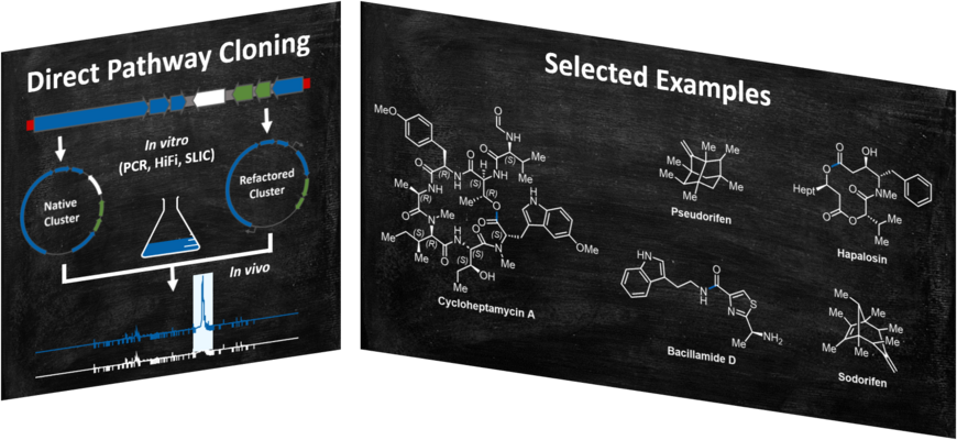 Die Biosynthese von Naturstoffen in Organismen wird durch Enzyme katalysiert. In den Genomen mikrobieller Naturstoffproduzenten werden diese Enzyme meist in sogenannten Biosynthesegenclustern (BGCs) kodiert. Dies ermöglicht es, Biosynthesewege durch moderne bioinformatische Analysen effizient am Computer zu entdecken. Zur Erschließung der durch sie kodierten Naturstoffmoleküle bedienen wir uns der Produktion in heterologen Wirtssystemen. Dafür werden interessante BGCs durch die Entwicklung und Anwendung von Klonierungsmethoden von den natürlichen Produzenten in effiziente mikrobielle Produktionssysteme transferiert. Ein Beispiel dafür ist das von uns entwickelte Direct Pathway Cloning (DiPaC). Diese Methode erlaubt es, interessante BGCs mittels PCR direkt zu amplifizieren und in Überexpressionsvektoren zu klonieren. Das Expressionskonstrukt wird vollständig in vitro assembliert, wodurch volle Flexibilität hinsichtlich der verwendeten Expressionsvektoren gegeben ist und potenzielle Probleme mit Produkttoxizität während der Klonierung umgangen werden. DiPaC erlaubt zudem die Umstrukturierung von Biosynthesewegen bereits während des Klonierungsvorgangs. Dies ermöglich zum Beispiel die Manipulation von Regulationsprozessen zur Optimierung der Produktion und die Deletion oder den Austausch Stoffwechselweg-spezifischer Gene für die Erforschung biosynthetischer Mechanismen (siehe unten).