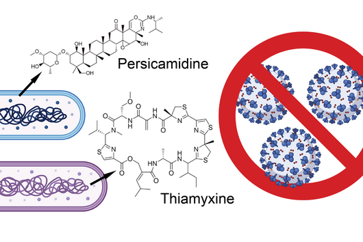 Beide Naturstofffamilien zeigen strukturelle Besonderheiten, welche im Falle der Persicamidine umfangreiche Strukturanalysen notwendig machten. Für die Thiamyxine gelang es, durch sogenannte Fütterungsexperimente mit speziell markierten Vorläufersubstanzen zusätzlich sogar ein Biosynthesemodell zu beschreiben. Für beide neu entdeckten Naturstofffamilien konnten die Wissenschaftler:innen eine starke Hemmung von RNA-Viren in Corona-, Zika- und Dengue-Virusinfektionsmodellen nachweisen. Im Falle der Persicamidine sind die Aktivitäten gegen SARS-CoV-2 und hCoV-229E sogar in etwa vergleichbar mit dem bedingt zugelassenen Medikament Remdesivir, welches für die Behandlung von COVID-19 eingesetzt wird.