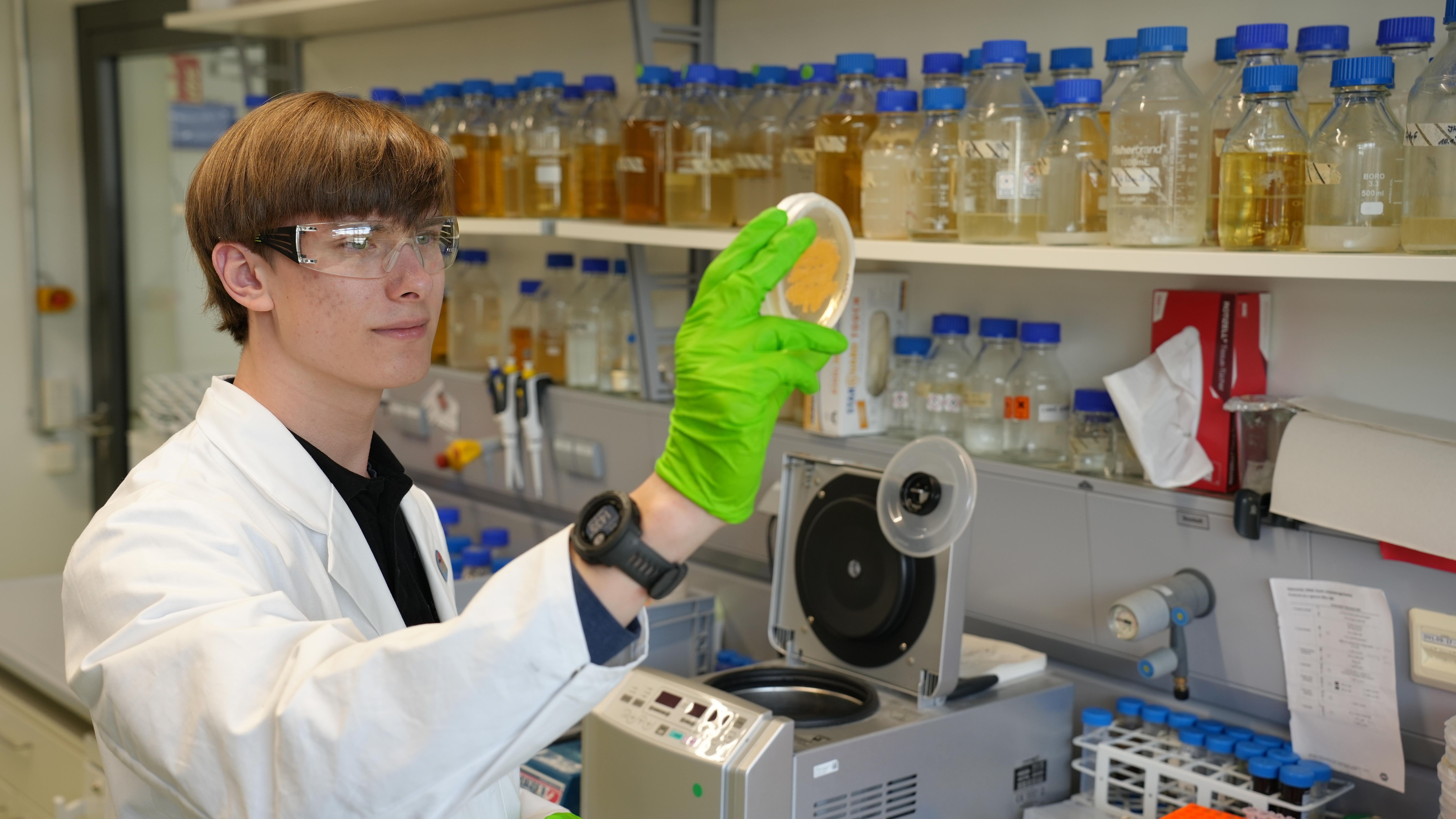 Saarbrücken, 4. April 2024 - Eigentlich würde man erwarten, dass ein Abiturient kurz vor den schriftlichen Abschlussprüfungen kaum Zeit für außerschulische Aktivitäten hat. Dennoch findet man Alexander Becker auch zu dieser Zeit regelmäßig in den Laboren des Helmholtz-Instituts für Pharmazeutische Saarland (HIPS). Dort versucht der 18-jährige Schüler des Gymnasiums am Stefansberg in Merzig Myxobakterien aus ganz besonderen Bodenproben zu isolieren. Diese Arbeiten sind Teil eines Projektes, mit dem er erfolgreich am Nachwuchswettbewerb Jugend forscht teilgenommen hat. Gemeinsam mit zehn weiteren Schülerinnen und Schülern aus dem Saarland konnte er sich so für den 59. Bundeswettbewerb von Jugend forscht qualifizieren, der vom 30. Mai bis 2. Juni 2024 in Heilbronn stattfinden wird.
