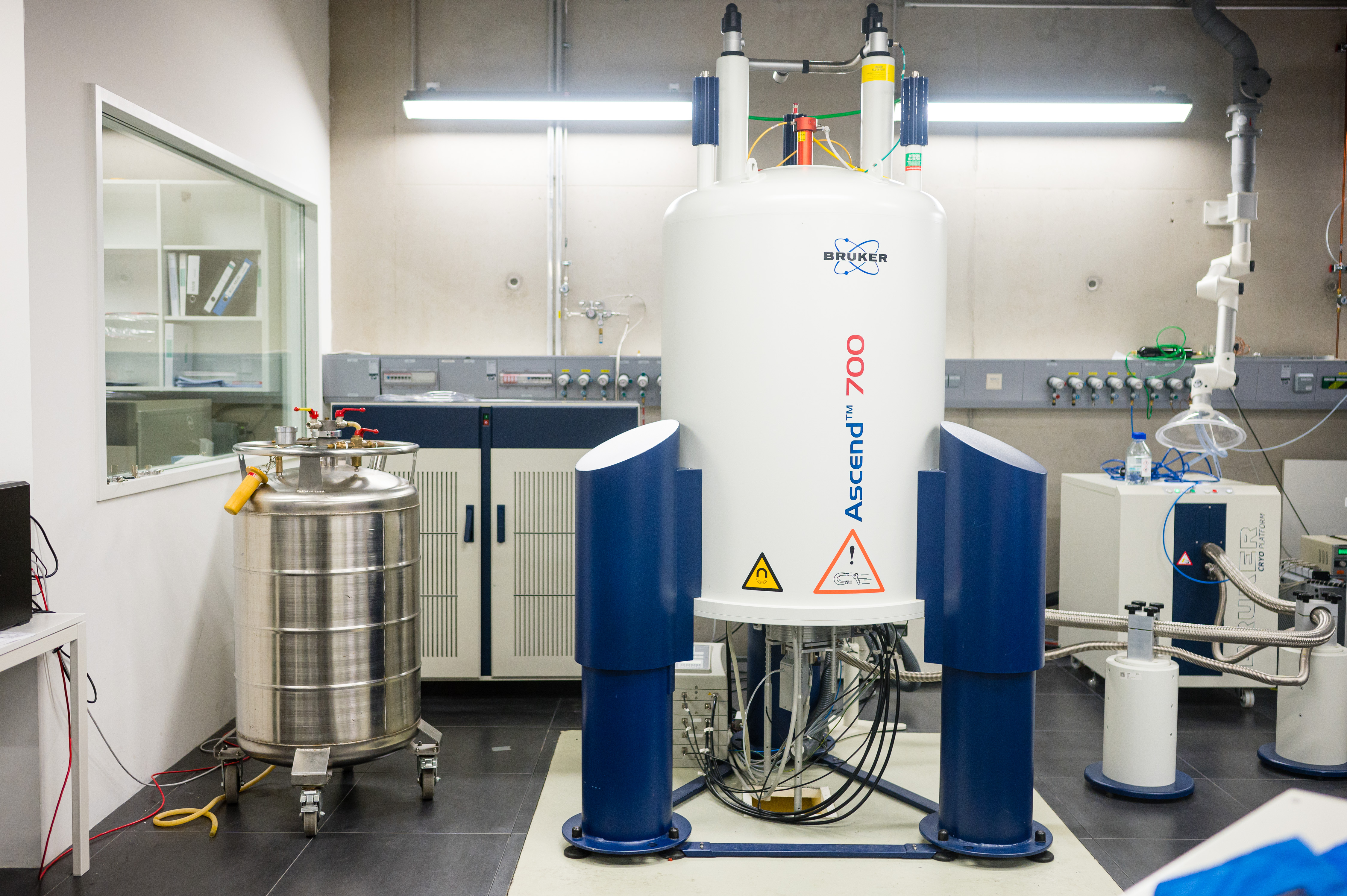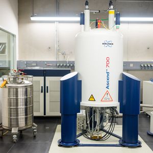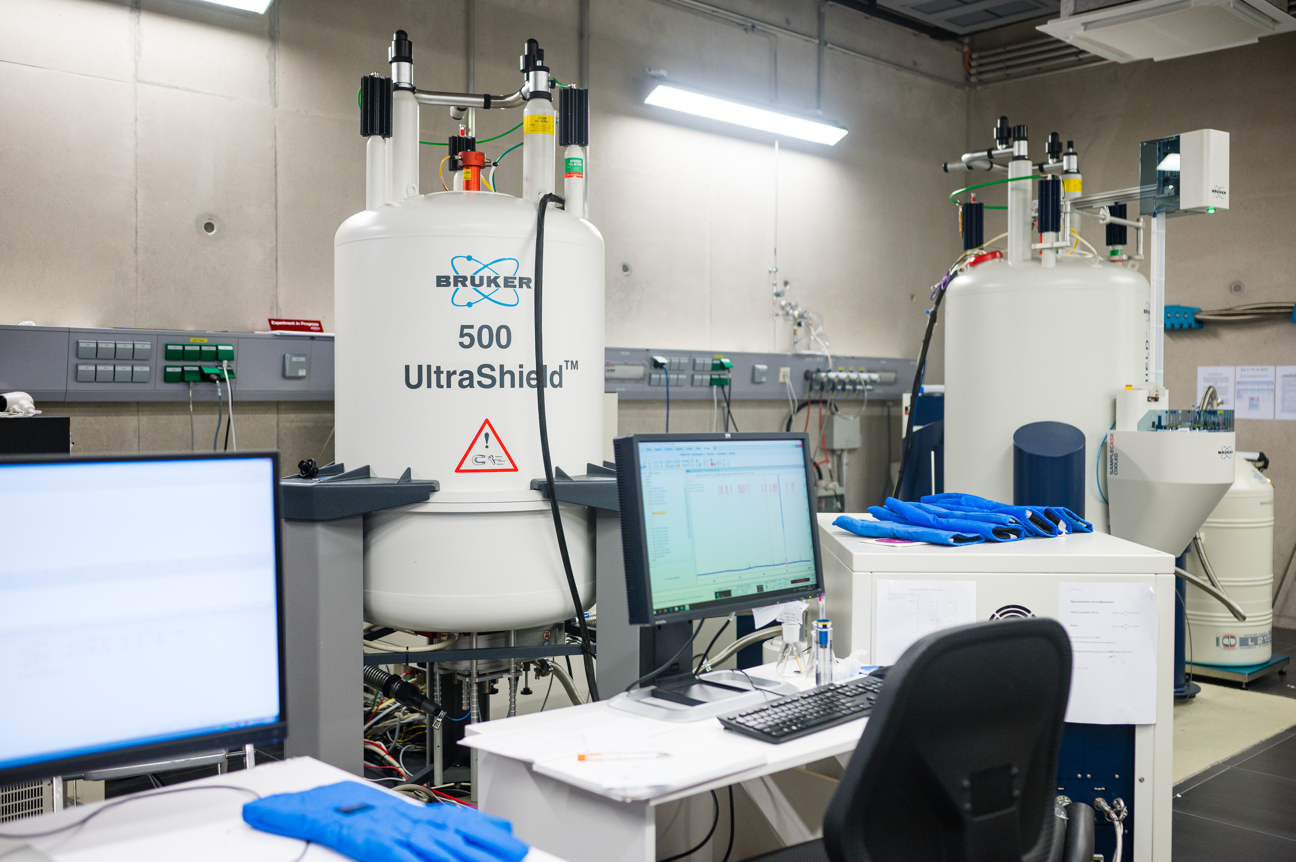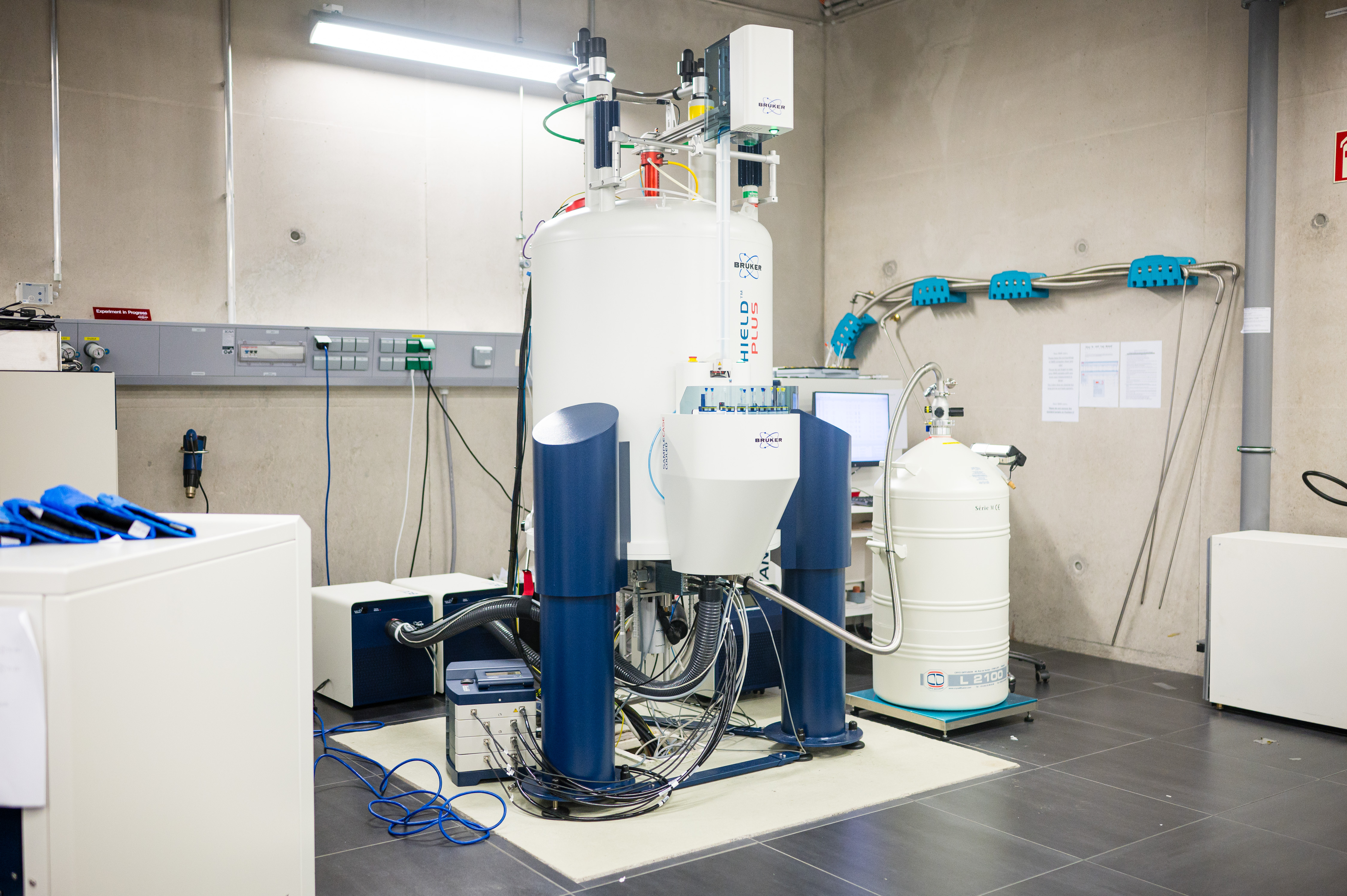 NMR spectroscopy is one of the most powerful tools for the identification and verification of molecular structures. We use our NMR spectrometers for routine measurements (e. g. structure verification in organic synthesis, standard 1D and 2D experiments) as well as for de novo elucidation of unknown structures and advanced, non-standard techniques. Our NMR department includes three different NMR devices (Bruker Biospin, Ettlingen), each of them having its own application focus: