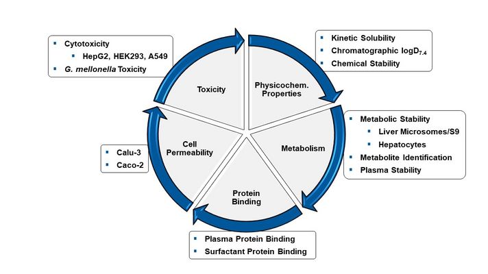 In the translational phase of transferring academic drug-discovery projects into treatment options (from bench-to-bedside), we put a strong focus on the determination of in vitro ADMET properties (absorption, distribution, metabolism, excretion and toxicity). For successful drug-discovery, it is of vital importance to consider these pharmacokinetic properties of a potential new drug candidate early on in a discovery campaign. Towards this end, HIPS has established a rational in vitro screening cascade to analyse ADMET properties such as kinetic solubility/ logD7.4, metabolic stability/plasma stability in diverse species, permeability across cell layers, plasma protein binding and cytotoxicity. The applied technology includes state-of-the-art UHPLC-MS/MS (Triple Quad/Orbitrap), which further allows identification of metabolites.