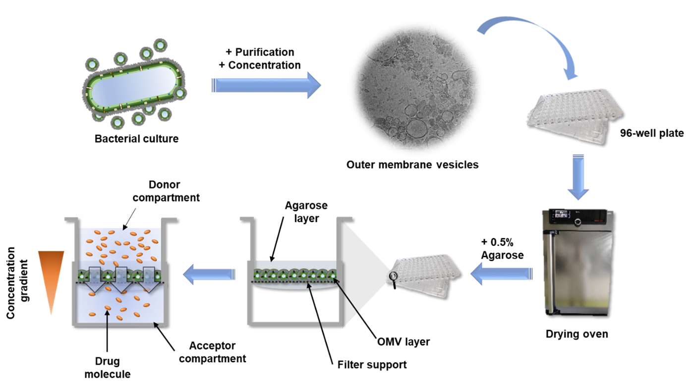 Extracellular vesicles are like tiny liquid-filled bubbles. They are surrounded by a biomembrane and are released by virtually all types of cells to their environment. They fulfil various tasks, for example horizontal gene transfer, cell-to-cell communication, defense against predatory microorganisms or immune modulation. OMVs are one type of extracellular vesicles. They originate from the outer membrane of Gram-negative bacteria and feature typical membrane components like phospholipids, lipopolysaccharides, porins as well as fragments of active uptake or efflux transporters. This is what makes them attractive as a material for an in vitro membrane permeation model.