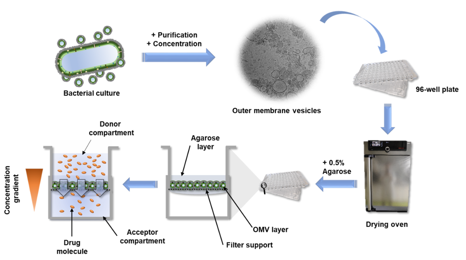 The high-throughput of this assay is possible due to the option to quickly read out the compound absorbance or fluorescence directly from the 96-well receiver plate, on which the filter supports are located. Alternatively, the receiver compartments can be converted into donor compartments and sampling can be done in situ from the top of the coated filter supports via liquid handling systems. Such samples can then either be quantified by UV-vis spectrometry, fluorimetry or chromatographic methods. The dependency of this assay on very basic materials allows it to be implemented in various labs and the application is easy to learn. Hence, other scientists can easily test their new drug candidates on their self-made OMV-based model and maybe even further optimize and characterize it. The ‘Linux’ among the in vitro assays one could say.