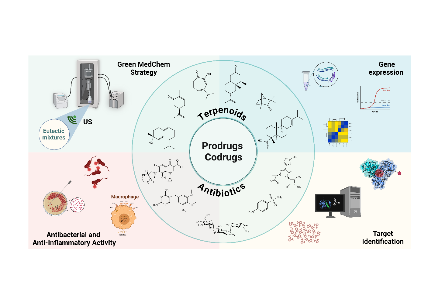 This project aims to elucidate molecular mechanisms driving the dual-targeted action of terpenoid-derived hybrids against bacterial infections. To address this issue, the strategy of molecular hybridization will be employed, which involves the conjugation of bioactive pharmacophores with terpenoid scaffolds into a single molecule. Thus, in addition to their multi-target effects, these prodrug/codrug molecules will also enhance membrane permeability, thereby improving the overall bioavailability of the compounds. The rational GreenMedChem (Green Medicinal Chemistry) approach to synthesize molecules will be implemented, aiming to minimize or eliminate the utilization of hazardous substances in drug discovery. Hybrid terpenoid derivatives demonstrate dual functionality, effectively targeting bacterial pathogens while concurrently exhibiting complementary biological activities, such as anti-inflammatory effects. This dual action offers advantages by reducing the requirement for multiple medications, thus mitigating risks associated with polypharmacy.